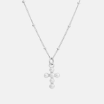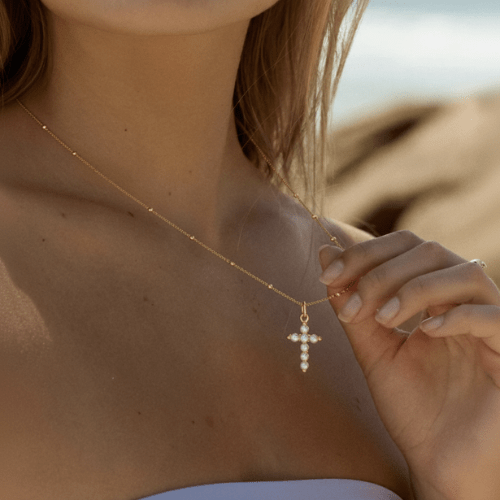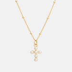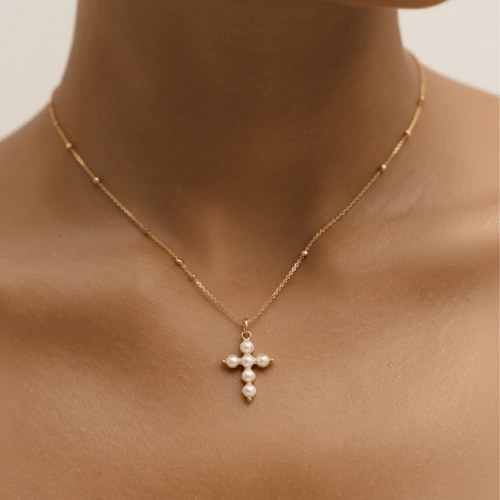 Grace meets modern elegance with the Celeste Pearl Cross Necklace. Featuring a delicate gold chain accented with subtle bead details, this necklace showcases a radiant cross pendant crafted from lustrous pearls. The harmonious blend of glowing pearls and polished gold makes it a timeless piece, perfect for layering or wearing as a statement of faith and style.